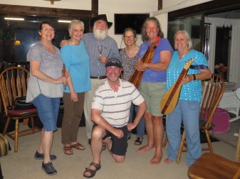 And later on in the day, Cullowhee, NC, after a tasty dinner at a local Mexican restaurant, we settled into an evening of jamming at Bruce and Lille’s place. What a group! The fellow in the front is Jamie Gilchrist, of Scotland, who was attending Dulcimer U. The highlight of the evening was when Jamie attempted to resurrect a dead bagpipe. After many squeals, squawks and a bit of duct tape, success!
